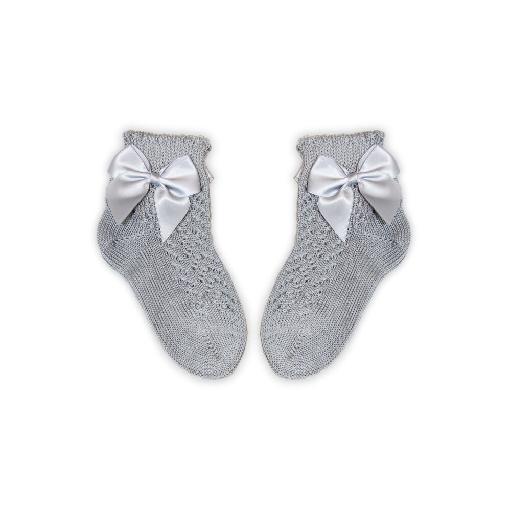 100% pamut kislány baba bokazokni horgolt felsőrésszel - masni díszítéssel - szürke - 20-21