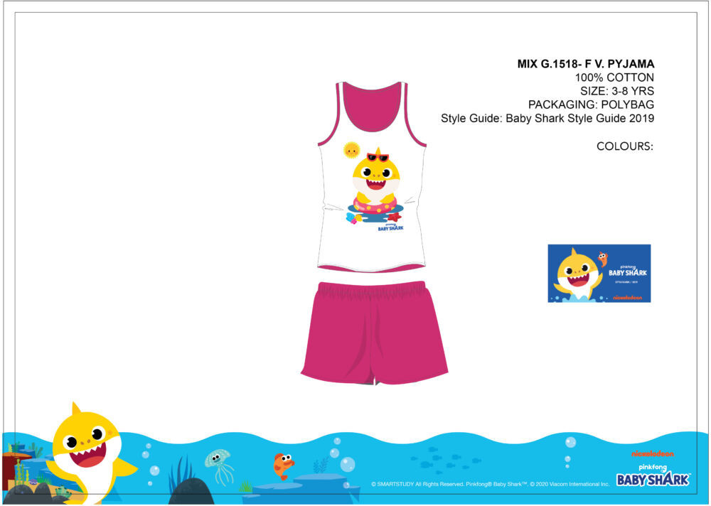 Baby Shark Summer-Jersey-Pyjama für kleine Mädchen aus 100 % Baumwollmaterial. Angenehmes, hautfreundliches Tragegefühl. Das Produkt ist in einer Geschenkbox erhältlich.