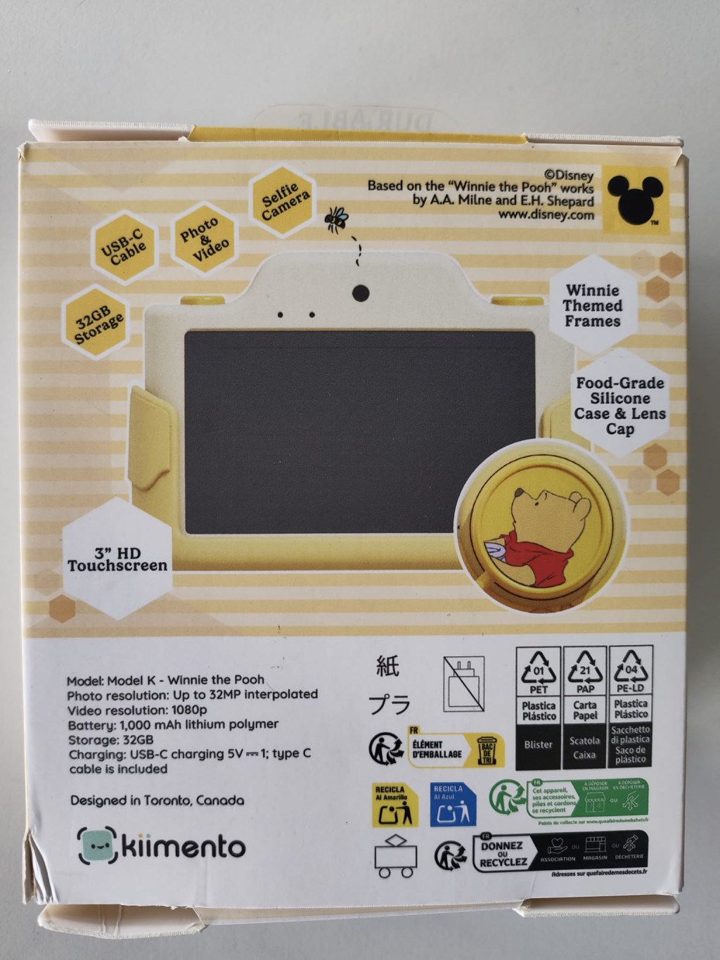 Kiimento Winnie the Pooh Model K Fotocamera digitale per bambini, Grande fotocamera selfie touchscreen, l'attrezzatura perfetta per i piccoli fotografi principianti. Registrazione: foto fino a 32 MP*, video 1080p. Registrazione: foto fino a 32 MP*, video 1080p. Obiettivi: Principale + selfie. Obiettivi: Principale + selfie. Visualizzazione: 3 Schermo: touch screen HD da 3 pollici. Strumenti creativi: oltre 20 filtri/cornici. Strumenti creativi: oltre 20 filtri/cornici. Alimentazione: 1000 mAh ricaricabile, USB-C. Alimentazione: 1000 mAh ricaricabile, USB-C. Contenuto della confezione: fotocamera, tracolla, cavo USB-C, scheda da 32 GB (preinstallata). Contenuto della confezione: fotocamera, tracolla, cavo USB-C, scheda da 32 GB (preinstallata). Avvertenza: pericolo di soffocamento - piccole parti; Non adatto a bambini di età inferiore a 3 anni. *Interpolato
