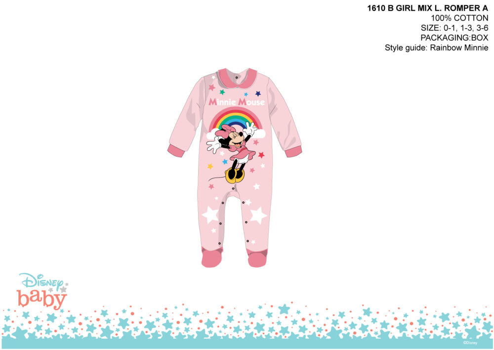 Tutina per neonato Disney Minnie realizzata in cotone al 100%. Grazie al suo materiale morbido e di qualità, il bambino si sentirà suo agio. Lo schienale e il sedile sono verniciati, per facilitare l'abbigliamento del bambino.